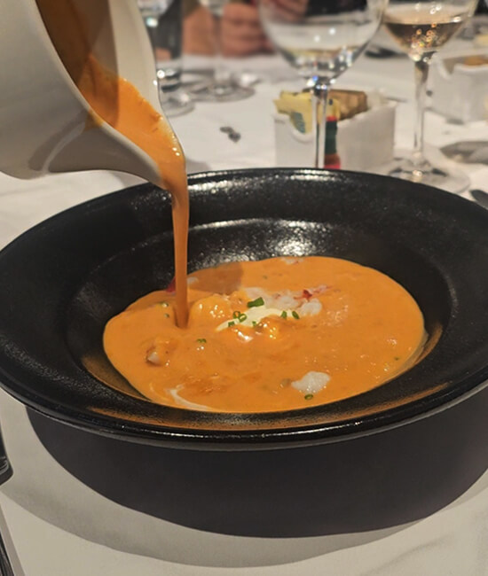 The Lobster Bisque arrived next, dense and unapologetically rich. Most holiday soups are timid affairs, but this was a liquid concentrate of the sea’s most expensive inhabitants. When paired with the Pouilly-Fuissé, the acidity didn’t just “complement” the cream, it performed a surgical strike on the fat, leaving my palate refreshed and ready for the meat that followed. It was an intelligent pairing, which is as rare as a perfectly rendered fat cap.