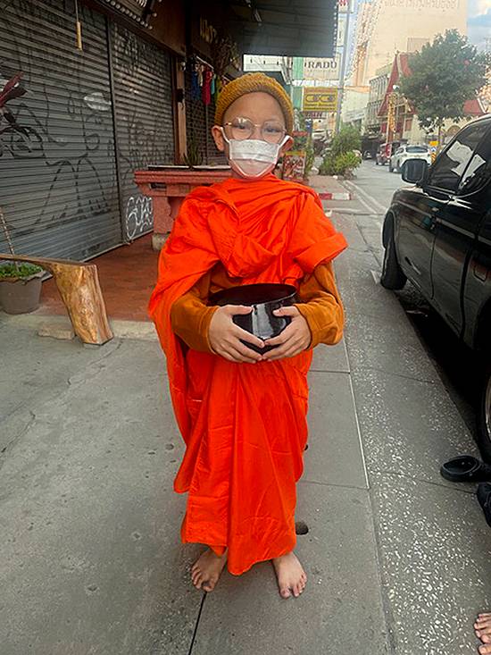 Between 6 and 7 a.m., the Buddhist monks walk the streets to receive food from the Thais and to bestow prayers on them in return. I am unprepared and have no food to offer this child, but am told I can give him money, so I give him 50 baht. He removes the cap on his shaved head, which keeps the chill away, when I ask if we can have our photo taken.