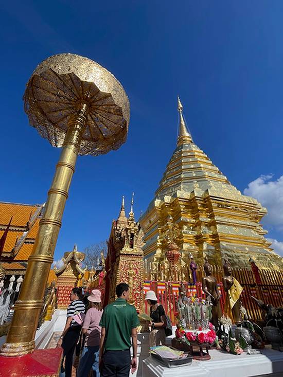 We visit the old walls of the city, built in the 13th century, before a moat and have our photos taken with pigeons. We tour the old city on tuktuks and find our jaws dropping at the magnificent temples. Mind you, this is a city with a temple on every street. On another day, I take the zigzag roads up the mountain of Doi Suthep and climb hundreds of steps to view the dazzling golden temple there.