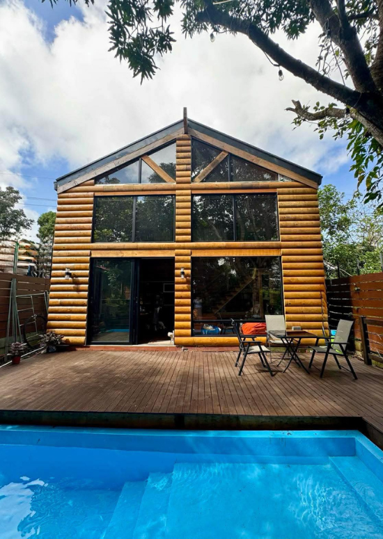 This accommodation has a modern, cozy cabin-style design featuring big windows overlooking the pool, with wood and stone elements adding to that rustic feel.