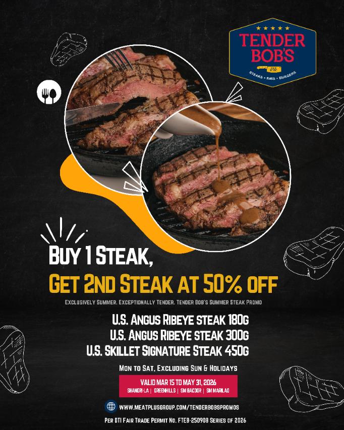 If you buy 1 US steak from Tender Bob's branches in Shangri-la, Greenhills, Bacoor, or Marilao, you can get another one at 50% off.