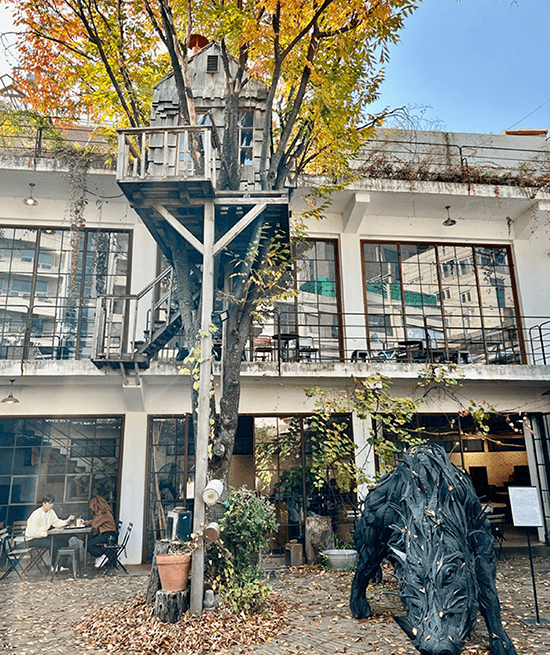 Formerly a dye factory, this café is owned by Hong Dong-hee, one of the pioneers in creating the Seongsu of today. It is an airy, warehouse-like space offering light meals, pastries and really good coffee. Modern installations are found in different areas. However, not to be missed is the outdoor area with a huge metal wild boar, and a treehouse of your childhood dreams.