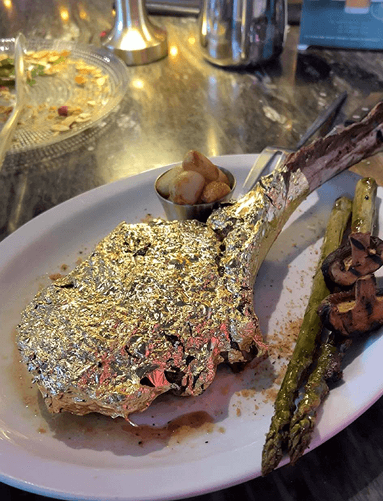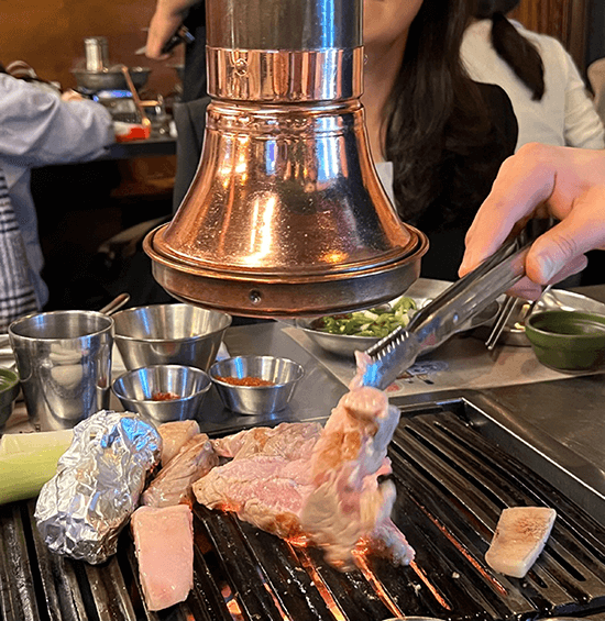Multiple chandeliers hanging low amidst brick walls is a hint of the luxurious meal you are about to have. This trending restaurant, which is highly rated in Naver (Korea’s Google), serves “golden steak.” You order from set menus (perfect for three people in my opinion) that includes a fantastic salad (I can’t forget it!), pasta, and the golden steak. We had a Tomahawk entirely covered in gold leaf. I felt like King Midas.