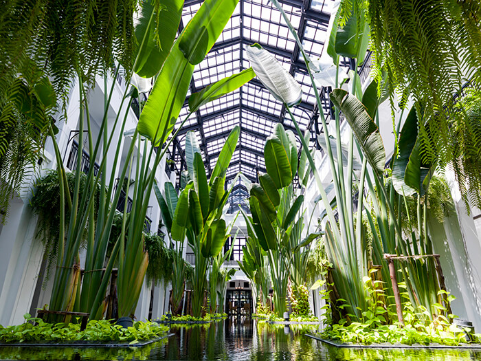 The journey through the gorgeous black and white marble-floored lobby courtyard, and the soaring atrium, is seamless and serene. Towering traveler palms and lush ferns flank an indoor water feature blended with a mild color palette of creams and silver, while mixed natural materials are incorporated throughout the hotel’s grounds, suites and signature restaurants.