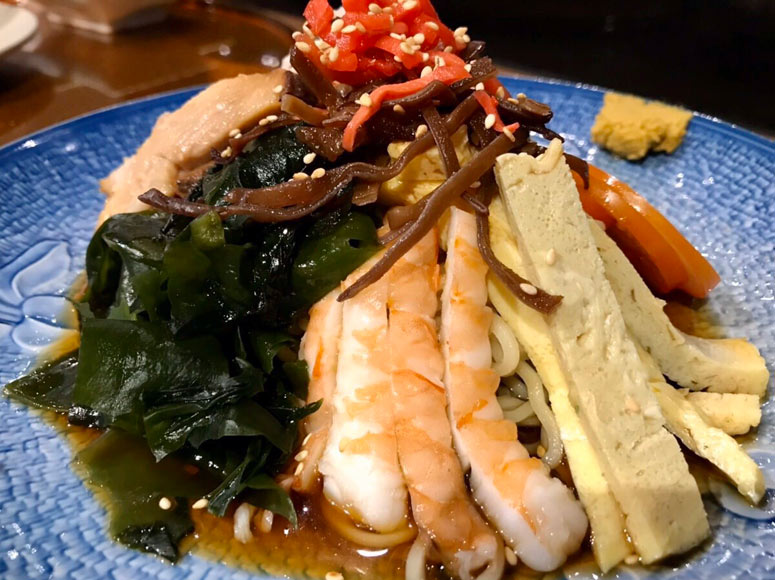 I also requested for hiyashi chuka, a cold ramen noodle dish served with prawns, shreds of kani, chicken or ham bits, tamago, tomato slices, cucumber, red ginger and a sweet tare sauce or broth that I pour in.
