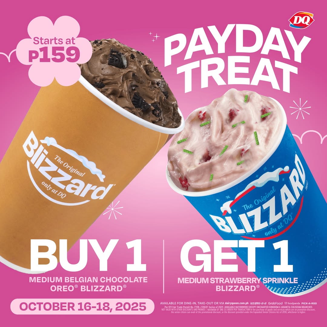 If you buy one Medium Belgian Chocolate Oreo® Blizzard, which starts at P159, you can get one Medium Strawberry Sprinkle Blizzard for free.