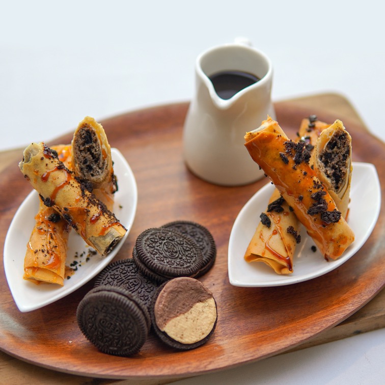 - In a bowl, mix together the cream cheese, sugar, milk powder, and Oreo peanut butter and choco. 2. To wrap the turon: On a clean, flat work surface, lay a wrapper. Place 1 tablespoon of the Oreo mixture lengthwise on top of the lumpia wrapper. Fold the bottom part over the filling and then fold in sides. Starting from the bottom, roll up the wrapper to form a tight log around the filling. Lightly wet the top corner of the wrapper with water and cornstarch mixture and press to seal.