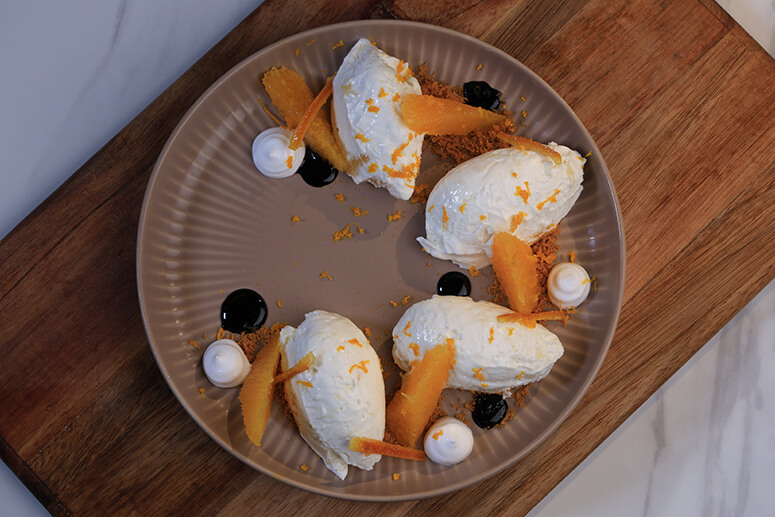Cap the meal with something light and luminous: the Honey Citron Semifreddo. This eggless semifreddo, made with premium white chocolate, honey citron jam, and whipped cream, is delicately set and served over a bed of Biscoff crumble. Candied citron peels and fresh orange segments add brightness and texture, creating a dessert that feels indulgent yet refreshing—a gentle, citrus-kissed finale to a deeply satisfying meal.