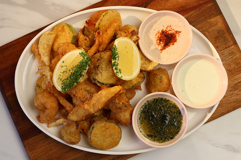 If you’re dining with a crowd, the Fritto Misto is non-negotiable. A bountiful mound of crisp-fried shrimp, squid, tripe, mackerel, and seasonal vegetables arrives golden and impossibly light, made for passing around the table. It comes with a trio of house-made dips—tomato aioli, cool tzatziki, and pesto vinegar—each adding a different Mediterranean accent to every bite.