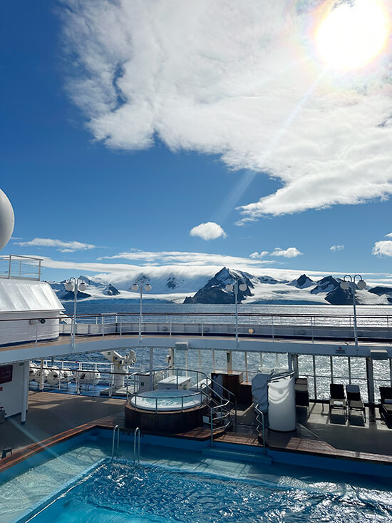 The Silver Cloud of Silversea Cruises served as both an ultra-luxe floating home and sanctuary. Its design exuded elegance throughout. Outside, powerful winds swept across the ocean, yet inside, we felt warmth and impeccable service. The spa offered complete relaxation, while the gym overlooked endless horizons of water, ice, and sky. The Panorama Deck became our vantage point to observe the shimmering ice, breaching whales, and soaring seabirds. Even the heated swimming pool felt surreal in such an environment.