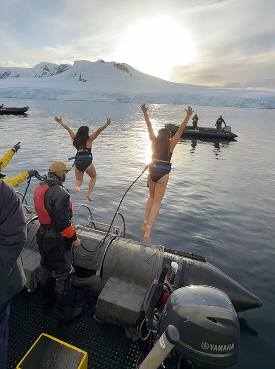 The restaurants offered extraordinary dining experiences, turning every sip and bite into a celebration in the middle of the icy wilderness. Alex and Sam even took part in the polar plunge, daring to jump into icy waters while secured in a harness—an invigorating encounter with the freezing sea. They also kayaked amid breathtaking expanses of ice and snow.