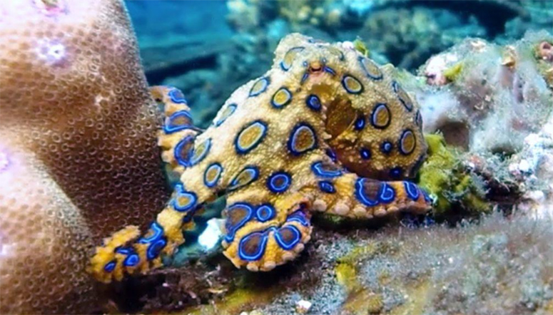 Blue-ringed octopus lives on the sandy bottoms and coral reefs of Samal Island, Palawan, and other diving spots in the Philippines. Its bright vibrant skin makes you want to pick it up; unfortunately, that is a terrible idea. These colorful cephalopods produce tetradotoxin — a neurotoxin that is 1,000 times stronger than cyanide.