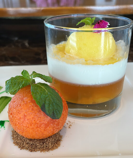 First is a layered dessert—chilled mandarin orange jelly with panna cotta, honey pearls and citrus sorbet. "We used the juice of the mandarin to make the jelly and for the sorbet, we used citron. There's a crunch that's also made with orange."