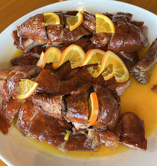 Served with it is the cutest mandarin orange served on a little bed of coconut sugar. The orange is made with deep-fried glutinous dough. Bite into it and you’ll find nian gao—or tikoy—inside. It’s a sweet medley of textures—crunchy, chewy—and a lovely way to end a great meal.