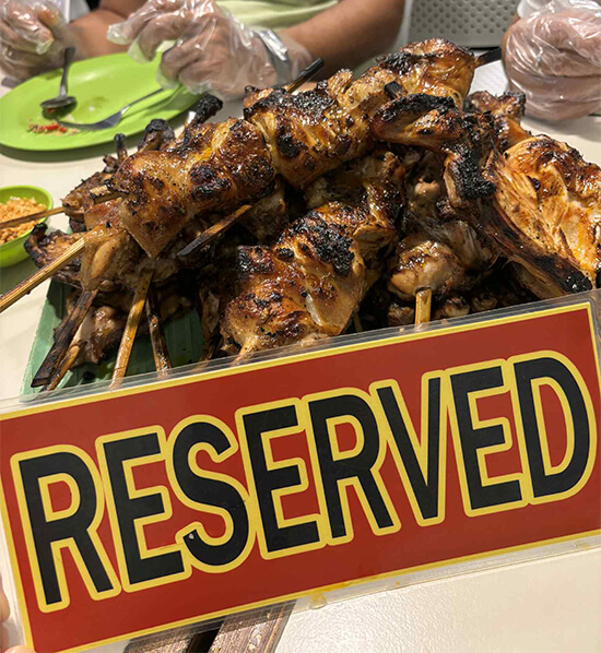 At the entrance of Aida’s, guests are invited in by a yellow chicken that looks like Big Bird’s gym rat cousin. Once shown to our seats, we ordered a large platter of grilled pork, chicken, liver, gizzard, skin, heart, and tail (okay, butt), java rice, chicken oil, and pitchers of cucumber juice. With a single-minded focus that would make a competitive eater proud, our group demolished it in under 20 minutes. Honest.