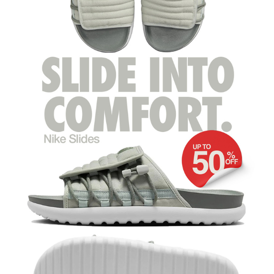 Nike Factory Store PH is offering up to 50% off on its Nike slides, including the Asuna 2 slide, which is now at P1,095 (previously P2,195), and the Calm Mule is now priced at P2,395 (P3,695).