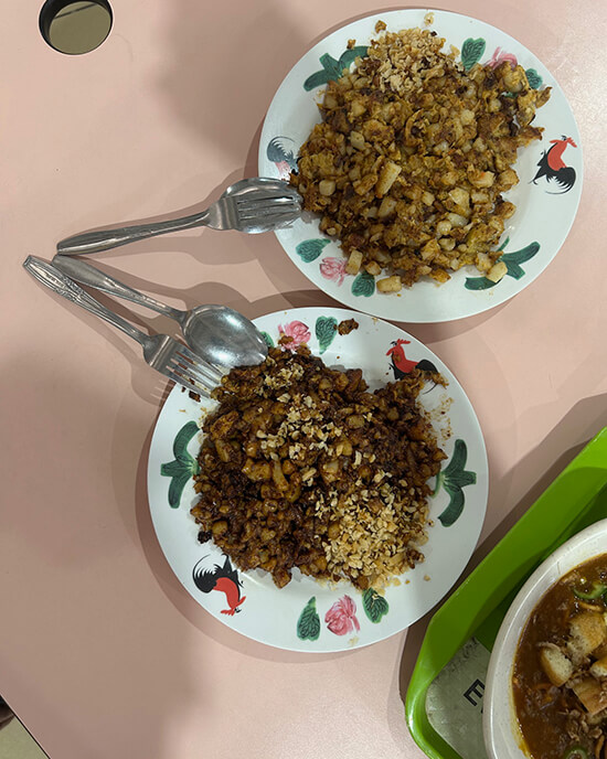 Chef Damian also met us at the Tampines Round Market and Food Centre with an array of dishes—his favorites from this lesser-visited hawker hub. Our brunch menu included a hearty pork rib and prawn noodle, another with gelatinous pig’s tail from Pig’s Viscera; two kinds of carrot cake—a black one tinted with sweet sauce and the white kind—from Song Han; and, from Nasi Lemak Specialist @ Street 11, a saucy mee rebus, a Malay noodle dish thickened with sweet potatoes.