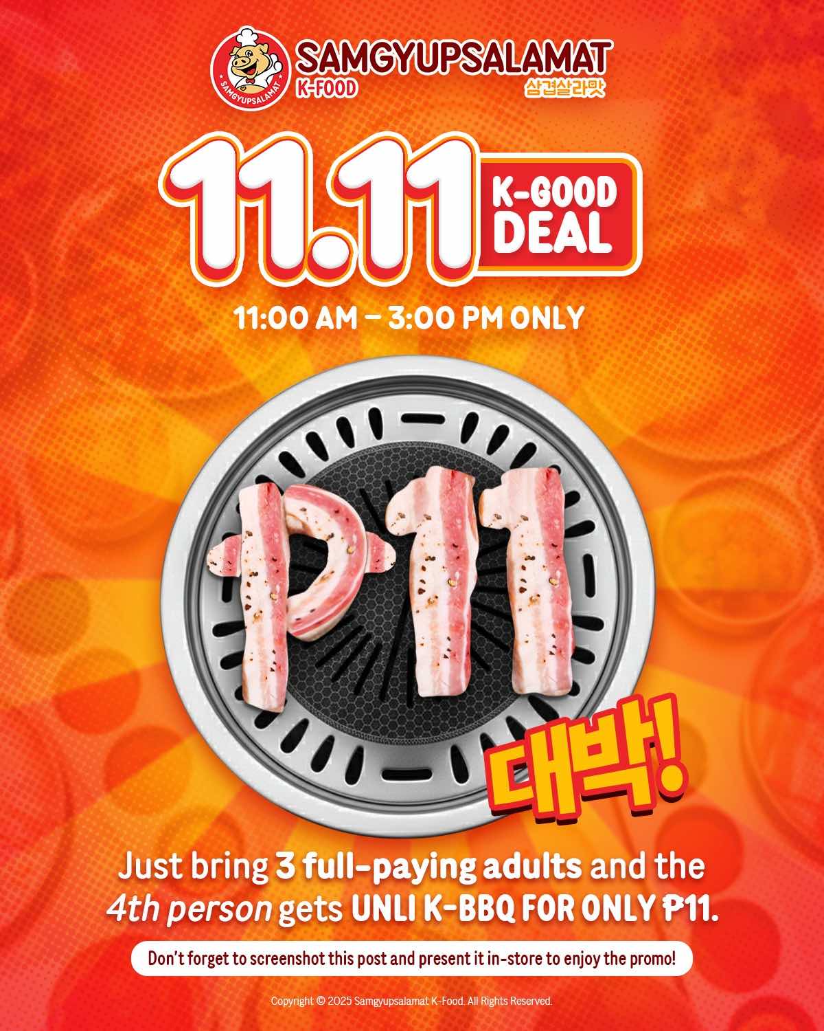 At Samgyupsalamat, you can enjoy unli samgyup for only P11 on Nov. 11.