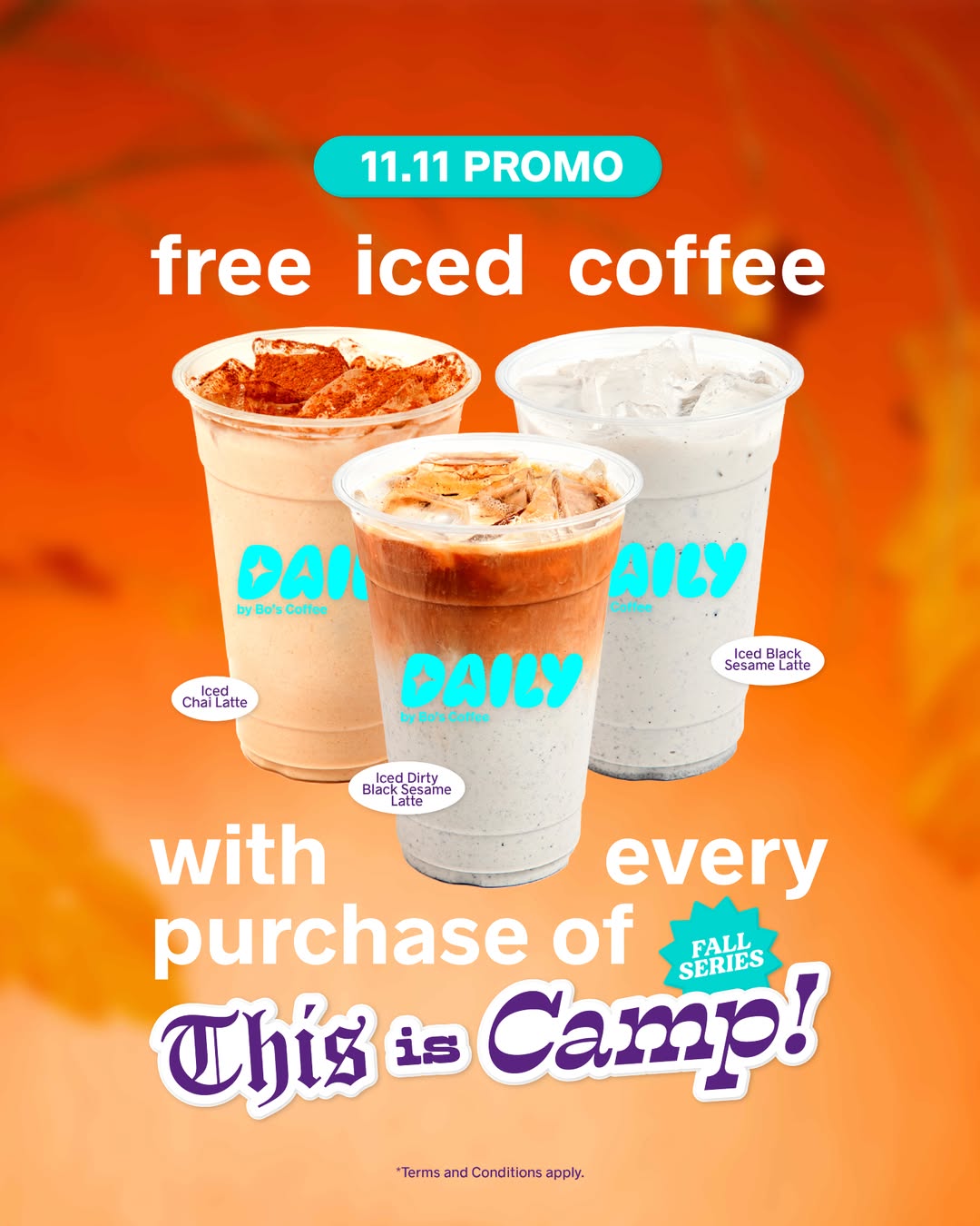 Just buy a "This is Camp!" Fall Series offering in medium from Daily by Bo's Coffee to get free iced coffee of the same size.