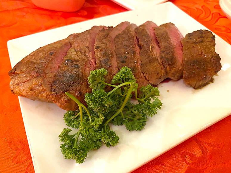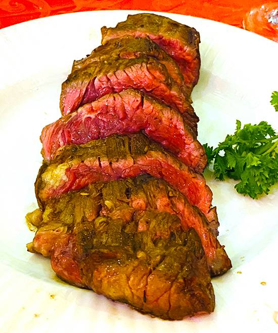 The flat iron is cut from the shoulder, delicious grilled with butter, up there with most prime cuts. But my hands-down favorite was the hanging tender. Imagine: just one cut from each cow, but the flavor was out-of-this-world succulent and juicy. No wonder it was wiped out at our table almost immediately.