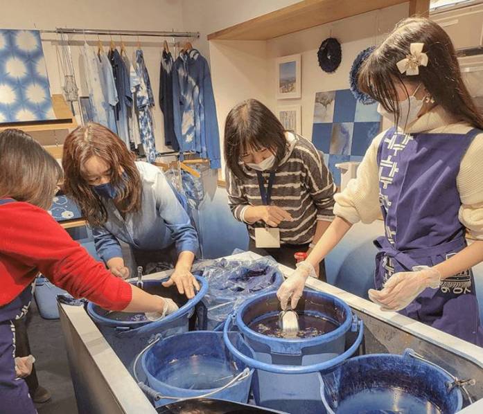 At the Mizuno Dyeing Factory, we participated in a workshop where we got to dye a tenugui (towel), through the art of Japanese traditional dye or shirushi-zome.