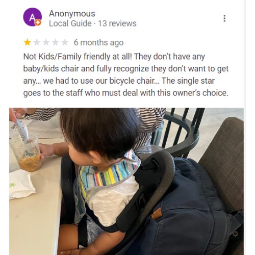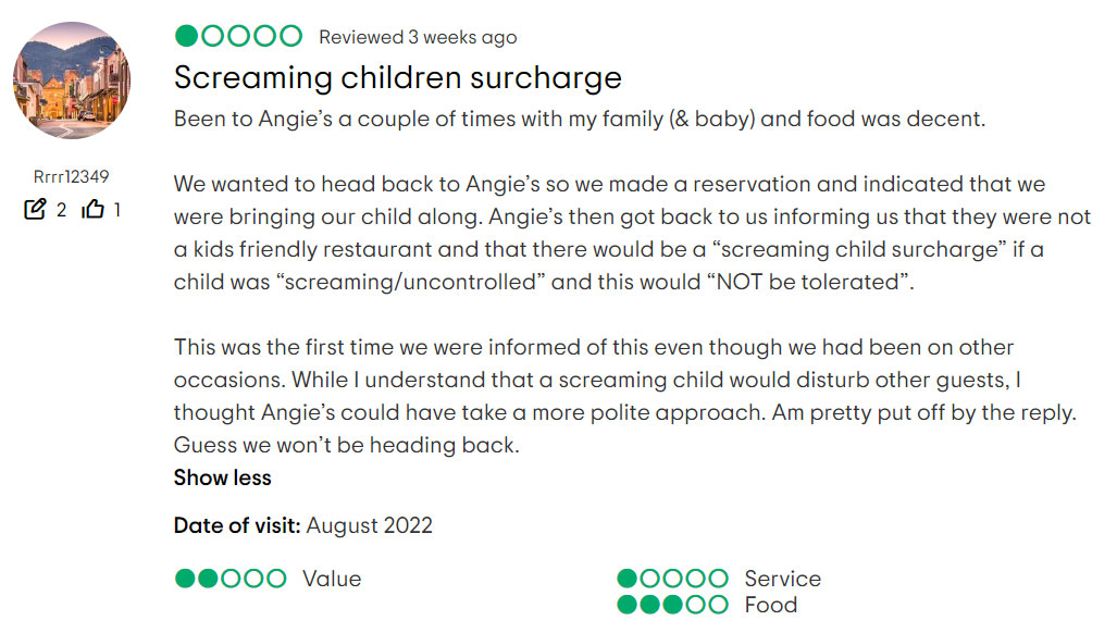 Angie’s has also received some negative reviews for not being family-friendly as they were not providing any baby chairs to some diners who brought their kids with them and only a space for a pram would be provided.