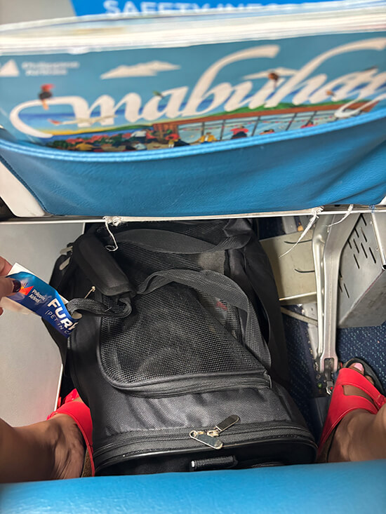 The fee is P2,500 per dog, per way (and it’s one dog per person). Don’t bother paying extra for bulkhead or exit-row seats, which we did, assuming we’d need the extra space. Designated FurPAL seats are at the very back of the plane, and everyone traveling with pets gets reseated there regardless. A couple flying with two dachshunds learned this the hard way, too—we were all advised to request refunds afterward.