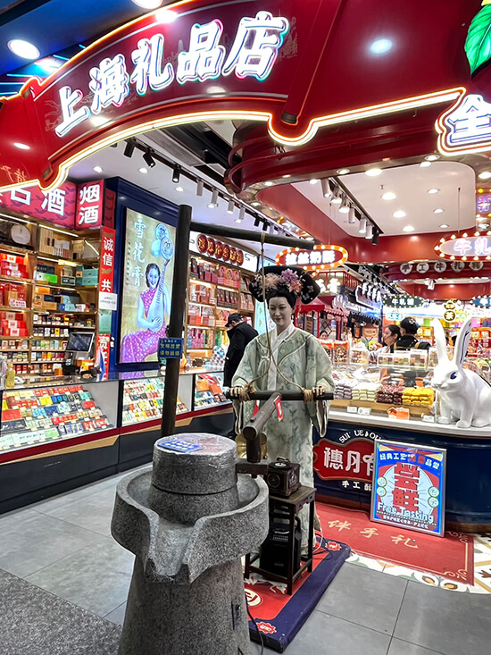 From sightseeing at the Bund, we turned the corner to Nanjing Road, one of the world’s longest shopping districts, going from East to West. What’s great is that it’s pedestrian-only up to Middle Henan Road, allowing you to crisscross both sides of the wide avenue. We found many historic stores selling everything from cheongsams to traditional crafts, as well as a humongous Pop Mart for Labubu collectibles. Local brands like Anta, which has grown to be one of the largest sportswear companies, and Tata sneakers (the softest and most comfortable, tipped our guide, and she was right) are good buys.