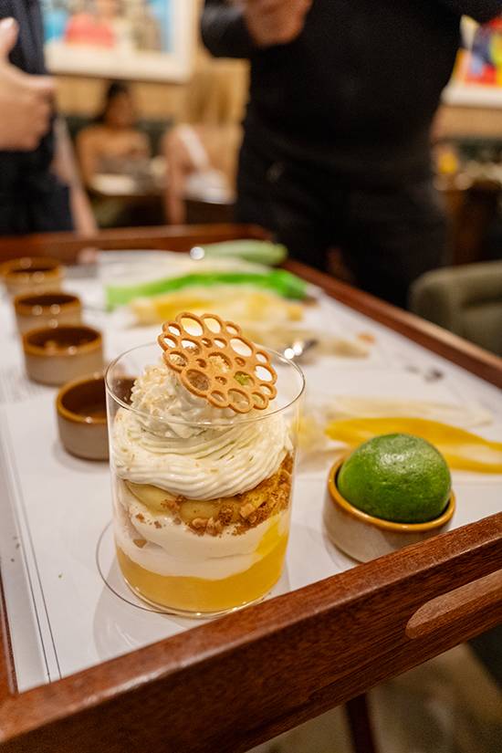 Chef Bea Therese Qua gave us a demo on how to prepare the Mango Knickerbocker Glory, a twist on a classic British dessert. Start with a layer of mango compote, followed by coconut shreds, then mango jelly. Add a layer of cream cheese diplomat, topped with mango sorbet. Pour in a splash of almond milk, then add lime juice and zest. Finish with desiccated coconut, lime shreds and a curl of lime peel.