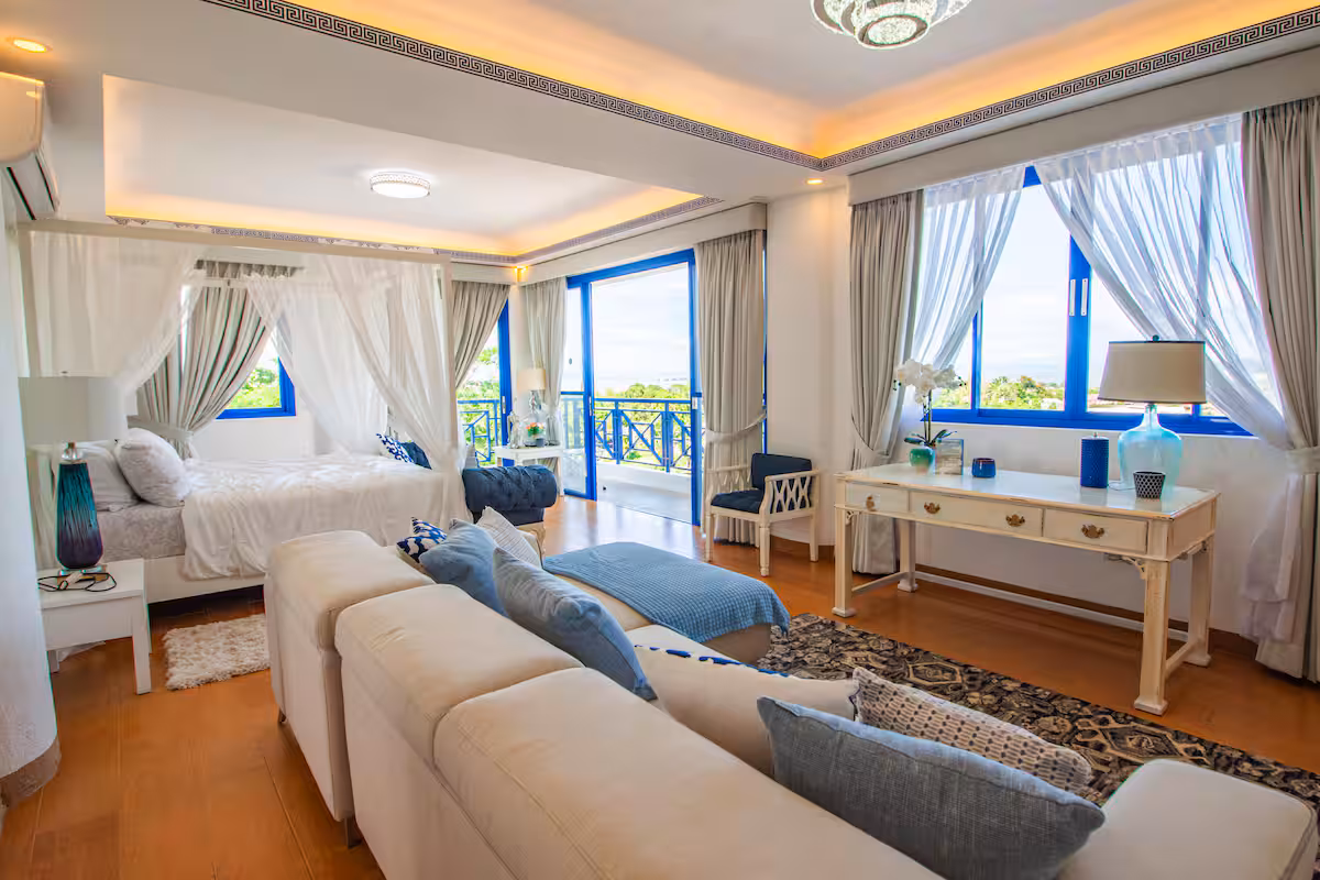 Get a taste of the island of Santorini without leaving Calamba, Laguna. This private home features a natural hot spring pool, an adult pool, a kiddie pool, and two cozy rooms. It’s designed for intimate gatherings in a calm and refreshing setting.