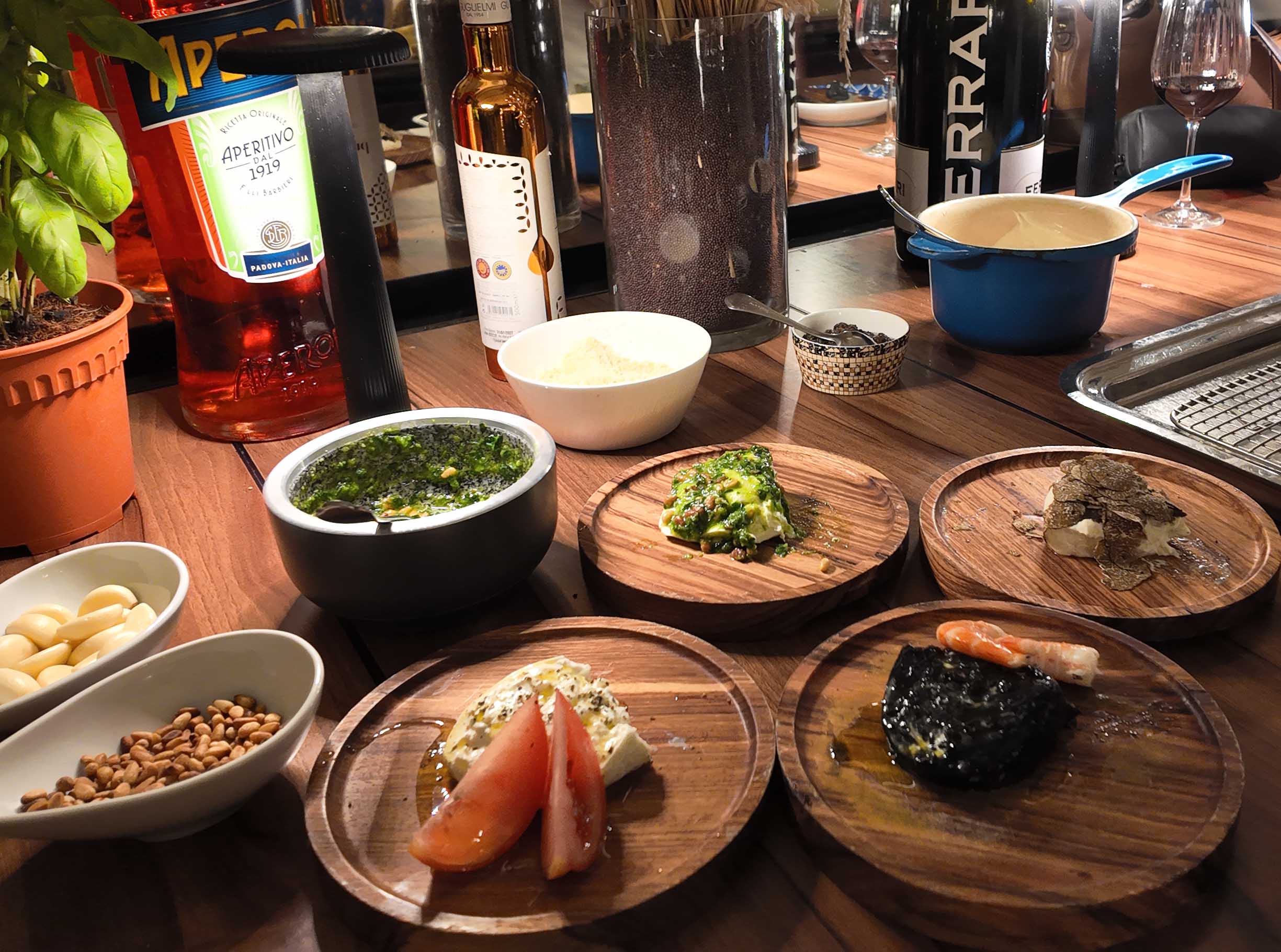 We started with a tasting of traditional Italian cheeses. The burrata was presented in a variety of ways: with freshly made pesto; with a squid-ink coating and shrimp; or simply with a drizzle of olive oil, salt, and pepper alongside sweet Italian tomatoes.