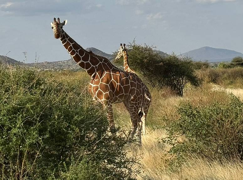 We checked in at Surana Lodge. It is an exquisite camp in the dry landscape marked with spots of lava stones and desert flora. We embarked on our first game drive in the afternoon, where we spotted the reticulated giraffes, whose habitat is in northern Kenya. I learned that giraffes may look alike, but some species set them apart. The reticulated giraffe is differentiated by its coat, which consists of large, polygonal, block-like spots that extend onto the lower legs, tail and face (according to Wikipedia). My granddaughters had with them a catalog of animals they expected to see and excitedly checked whenever they spotted one. Buffalo Springs National Reserve hosts zebras, impalas, antelopes, baboons and elephants. But the big cats were not around the reserve that afternoon, so we arranged to enter the adjacent Samburu National Park. I asked our guide about the difference between a national park and a national reserve. The former is government-owned and managed by the community, while the camps inside the reserve privately own the latter.