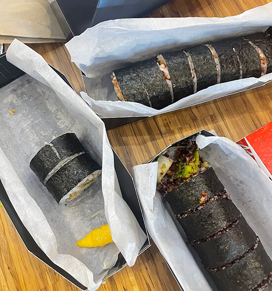 Like SaladStop!, Wooshi has fun, pun-intended combinations that you can choose from. The Maki Rolls include choices like Big Bang Tofu, which has grilled tofu, tempura enoki, toasted almonds, and creamy basil pesto. The Cali Crunch roll is filled with crabsticks, crunchy ebiko, avocado, and wasabi mayo. Tuna Turner features yuzu shoya tuna, chili crab sauce, and peanuts. Ebi-Thing has shrimp tempura, crunchy ebiko, Japanese ginger, and a yuzu teriyaki sauce.