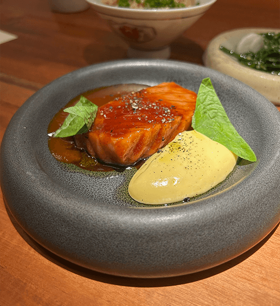 The main then came as a set: aged tuna belly kissed by the charcoal grill then glazed with a BBQ sauce made of tamarillo, pineapple and soy sauce; pork mechado jus; batitis hollandaise; pompano rice seasoned with mushroom broth; fermented radish; and native chicken broth.