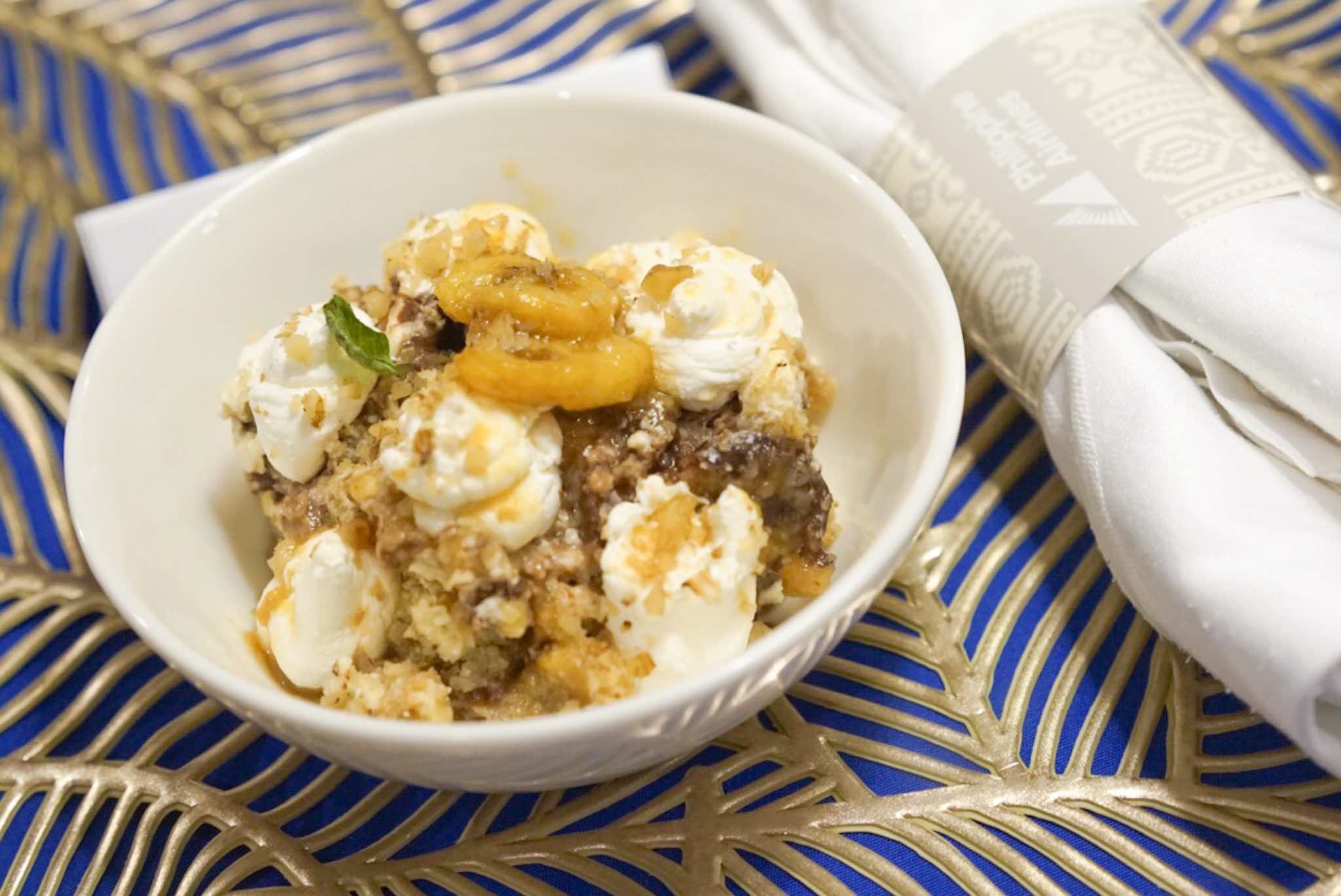 End your meal—and flight—on a sweet note with the Banana Budino Trifle with layers of banana cake, Spanish natillas, walnuts, milk chocolate, caramelized bananas, and whipped cream.