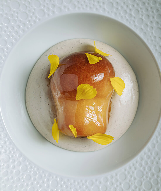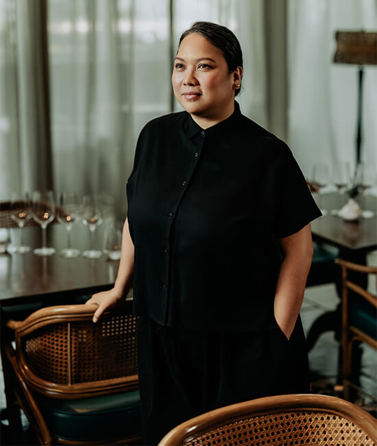 “Two of my favorite dishes are the fregola with guanciale and buro velouté, and the sweetbread with mushroom duxelles and conpoy.” She adds, “The buro comes from a dish I grew up eating at my cousin’s ancestral home in Arayat, Pampanga, so it’s tied to a very personal memory. The sweetbread was more instinctive. I put it together because I knew the flavors would work. The mushroom duxelles and conpoy have this umami punch that reminds me of XO sauce. It came naturally together.”
