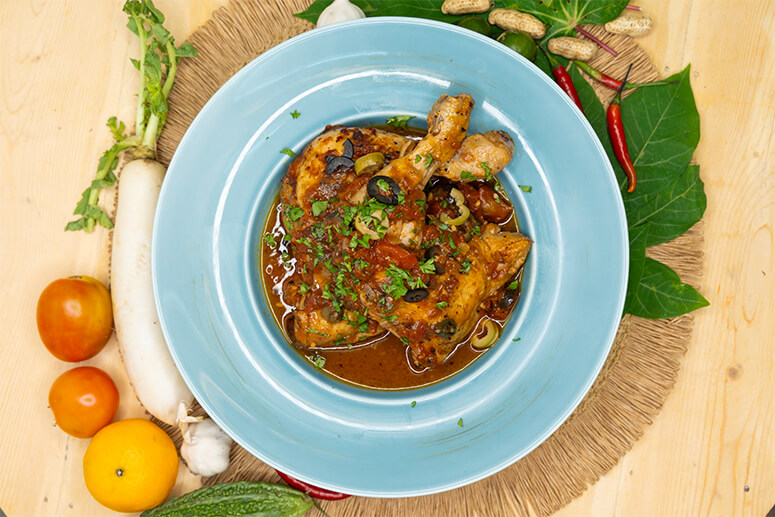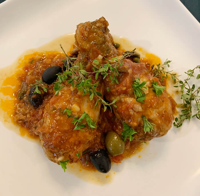 Return the chicken to the sauce and pour in the water. Mix well until water is combined into the sauce. Season with salt and pepper. Add the oregano, thyme, chili flakes and parsley. Simmer until the chicken is well cooked, about 20 minutes. Stir in the olives and capers and simmer gently. Turn the heat off and garnish with fresh parsley leaves before serving.