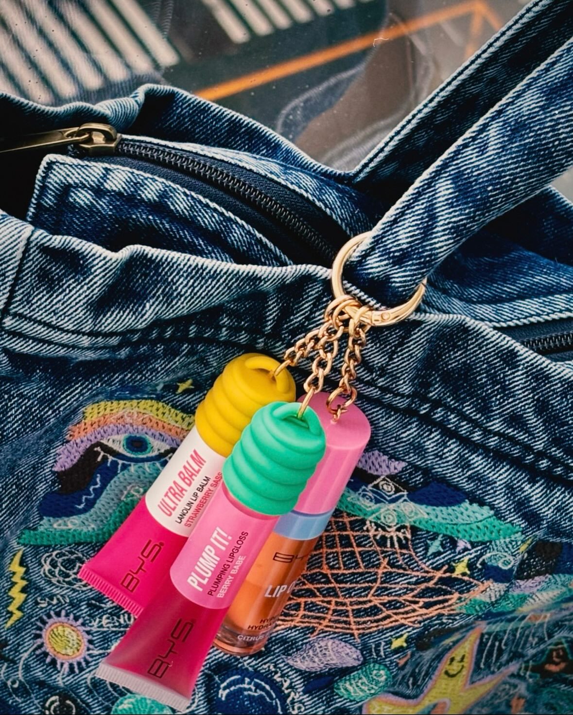 The lippies—Ultra Balm, Plumping Lip Gloss, and Lip Oil—come with a keyring that you can attach to your bag!