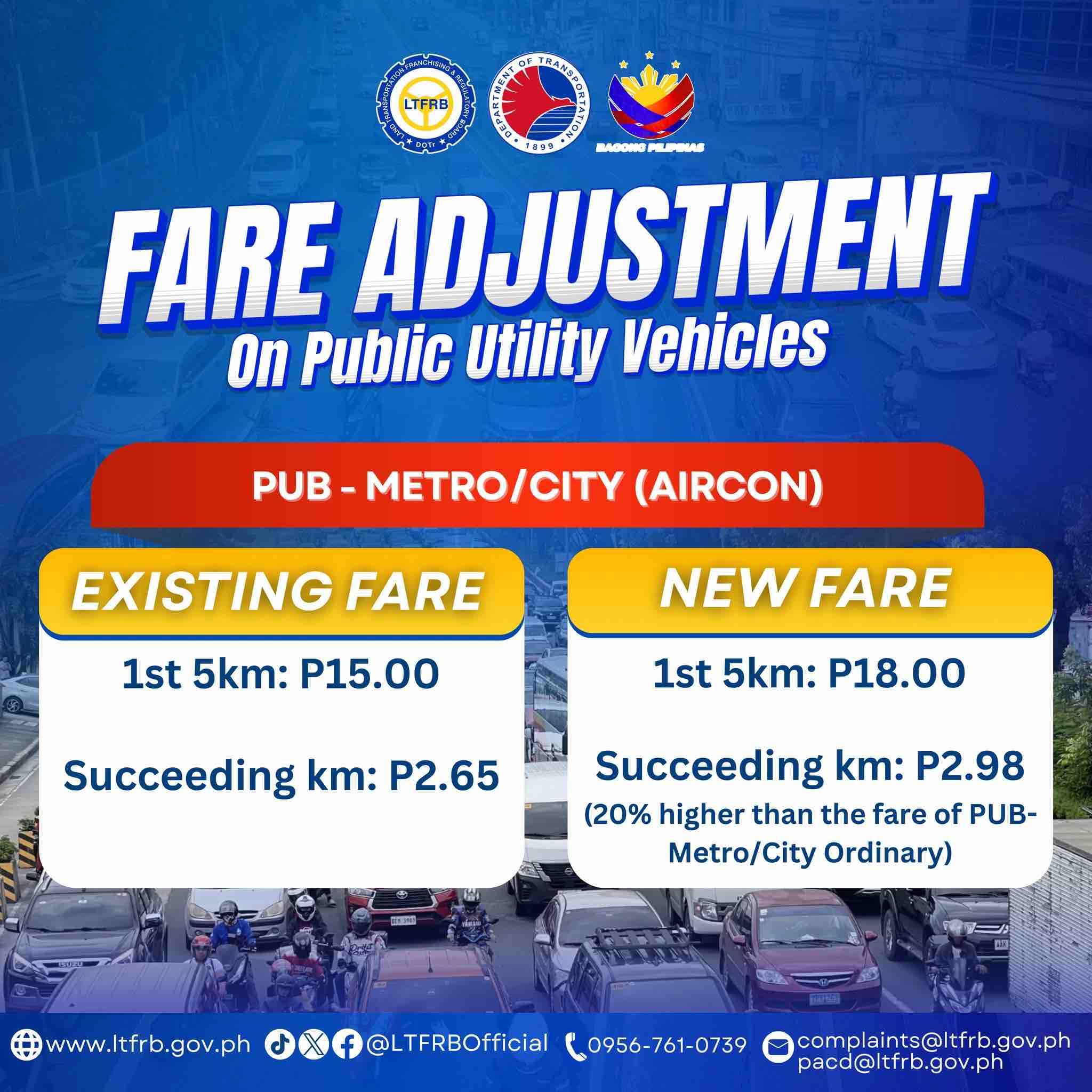 Commuters on air-conditioned metro/city buses will see a P3 jump in the starting fare, from P15 to P18. It will increase by 33 centavos for every succeeding kilometer, shifting the rate from P2.65 to P2.98.