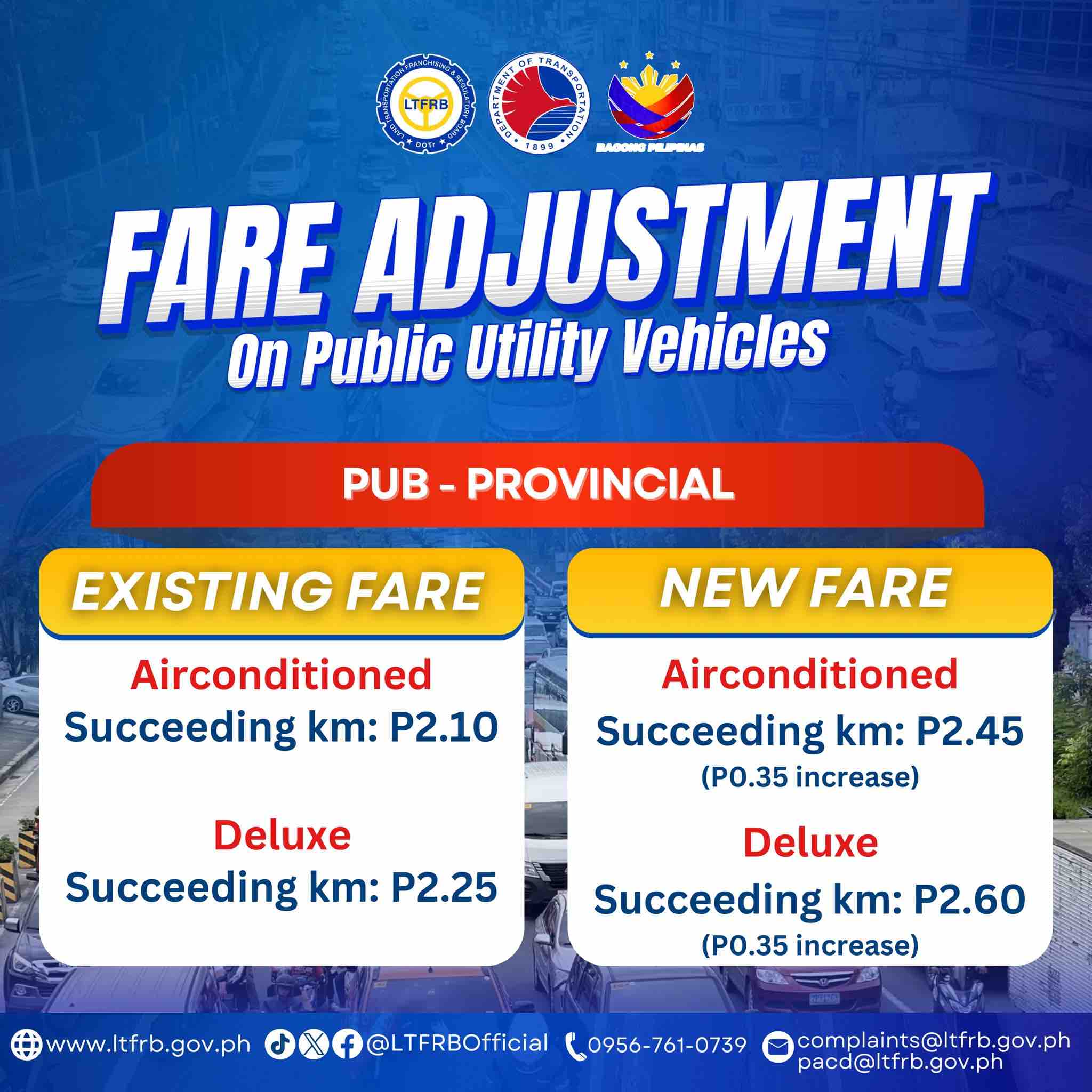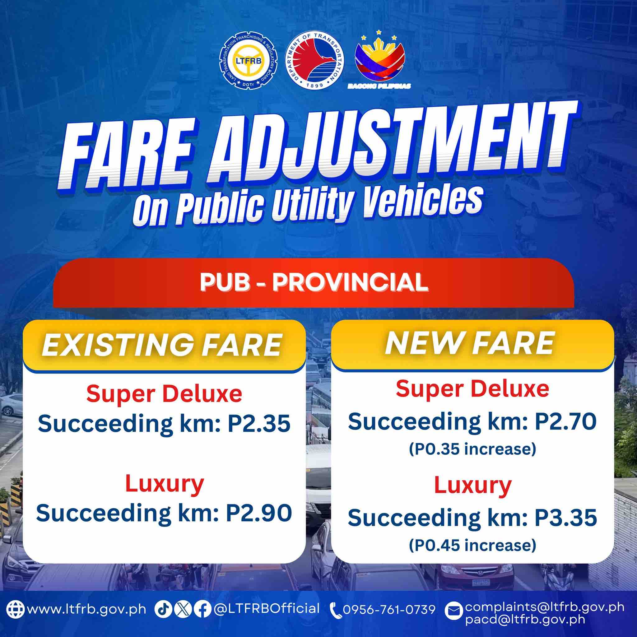 There will be an additional 30-centavo fare per succeeding kilometer (from P1.90 to P2.20) for ordinary buses; 35 centavos for air-conditioned (from P2.10 to P2.45), deluxe (from P2.25 to P2.60), and super deluxe buses (from P2.35 to P2.70); and 45 centavos for luxury buses (from P2.90 to P3.35) per succeeding kilometer.