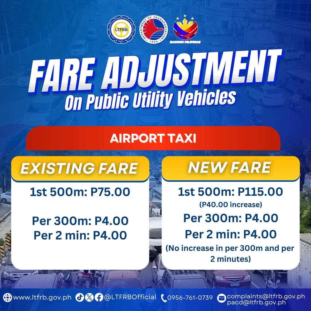 Airport taxis will have a P40 increase in the flag-down rate or the first 500 meters, raising it from P75 to P115.