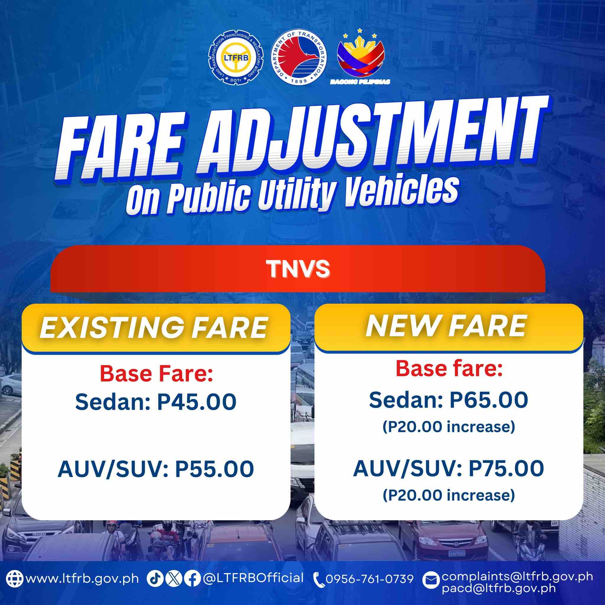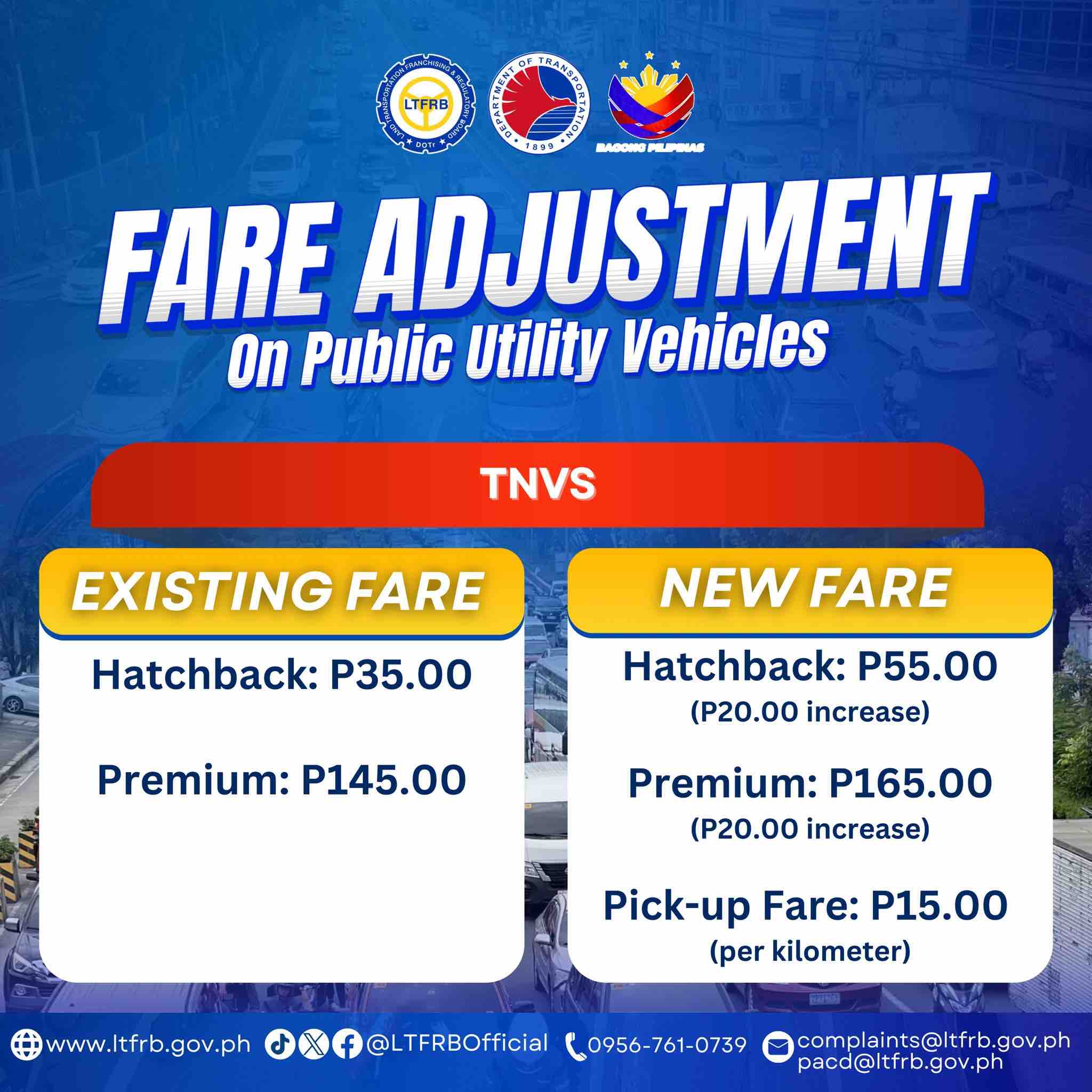 There will also be a P20 increase and a P15 pickup fare per kilometer for transport network vehicle services.