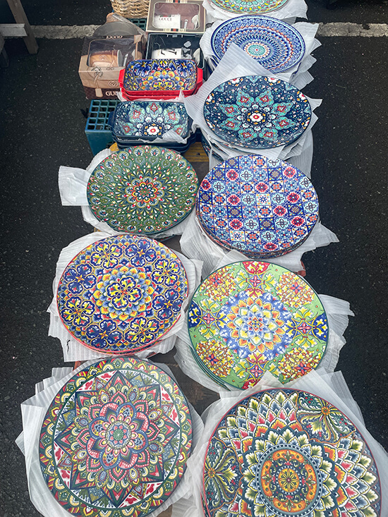 Nearby, also on a streetside stall, are elegant sets of dinnerware that are finely rimmed with gold and set on chargers. Chargers are the formal sort of underplate that go under your dinner plate for very special occasions. You usually see items like these only in our most exclusive department stores. Yet here they are, right on the street, gorgeous set after set in that minimalist kind of design that makes them look expensive. We wish we had engaged friends we could give these to as wedding gifts.
