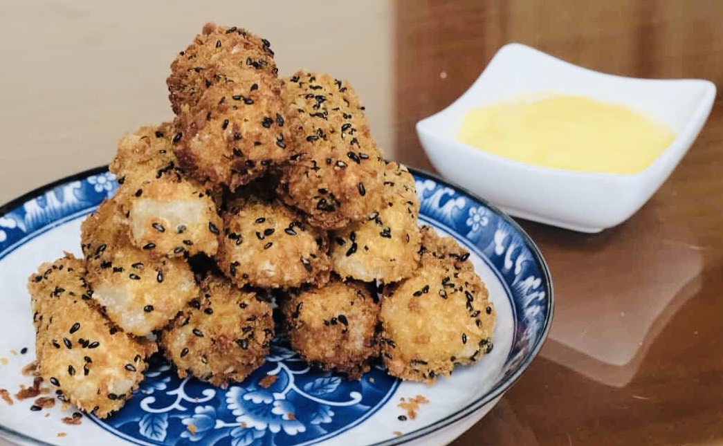 Procedure: Cut white tikoy into squares, then dip it into the flour and egg. Mix some black and white sesame into a bowl, and add some bread crumbs. Dip it again into the mixture of sesame and breadcrumbs, then fry it until golden brown. For the coconut mango sauce, you need to mix condensed milk with coconut milk and mangoes. Then you are ready to serve it for your friends and family to enjoy.