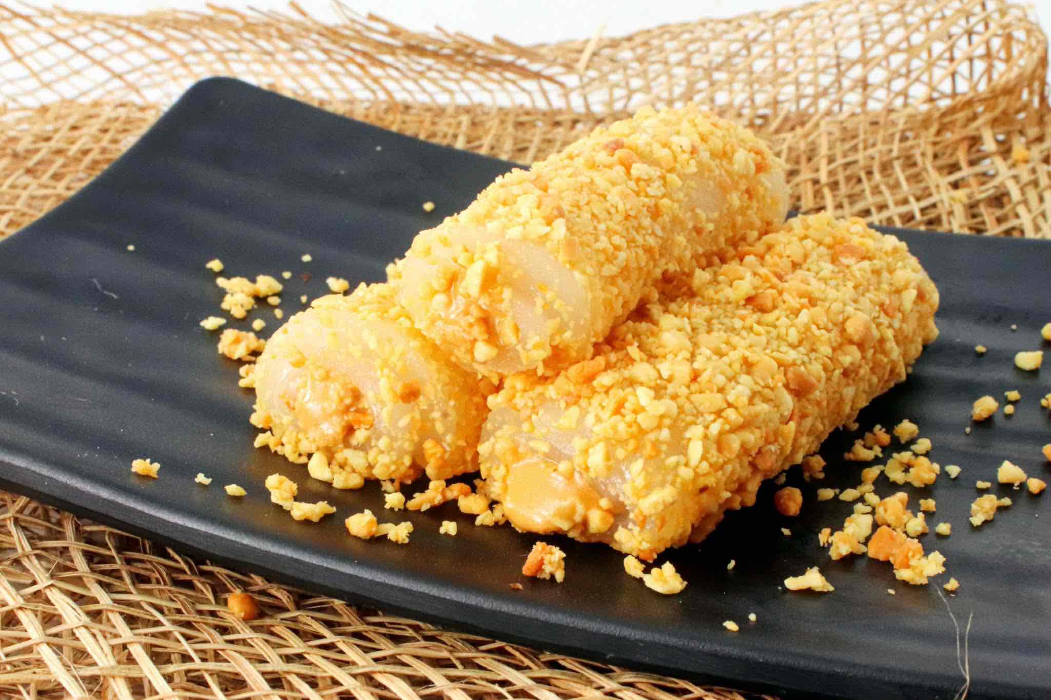Procedure: Prepare the peanut coating by roasting the peanuts in a preheated oven at 180°C for 8-10 minutes or until golden brown. Once cooled completely, grind the peanuts using a blender or food processor, then set aside. Slice the tikoy lengthwise about 4-5 mm thick, and arrange on a parchment paper lightly brushed with oil to prevent sticking. Steam the tikoy for 10-15 minutes or until soft and translucent. Transfer peanut butter into a pastry bag, and then pipe 1-2 tablespoons of peanut butter onto each steamed tikoy, and carefully roll them into logs. Roll the tikoy logs in ground peanuts until fully coated. Serve and enjoy.