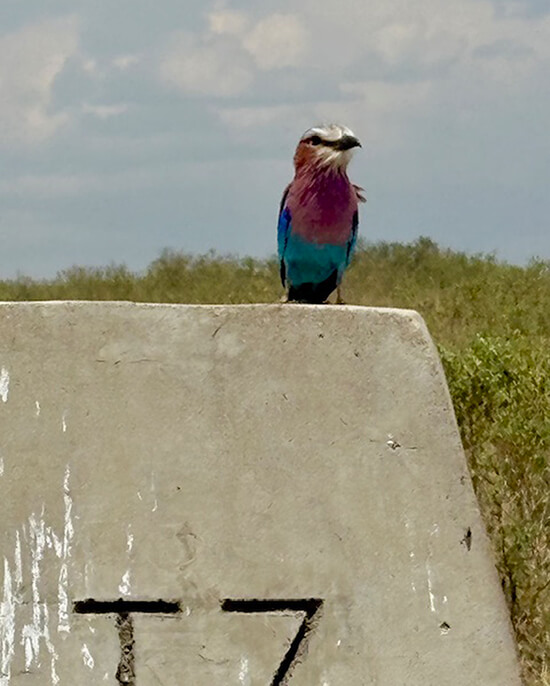Max had one final surprise for us before we headed back to Nairobi. He drove us to the border of Kenya and Tanzania, which is unfenced (since migrating animals don’t recognize borders), but lined with stone markers. Past the border, the Mara plains turn into the great Serengeti, which on this sunny day looked even more green and paradisiacal than our Kenyan viewpoint. Max drove over the border and under the arching canopy of a fig tree. We spread colorful Maasai blankets on the grass and had a picnic (illegally) in Tanzania, accompanied by superb starlings, a marabou stork and a lilac-breasted roller, Tanzania’s national bird with its colorful plumage of olive, burgundy and lavender.