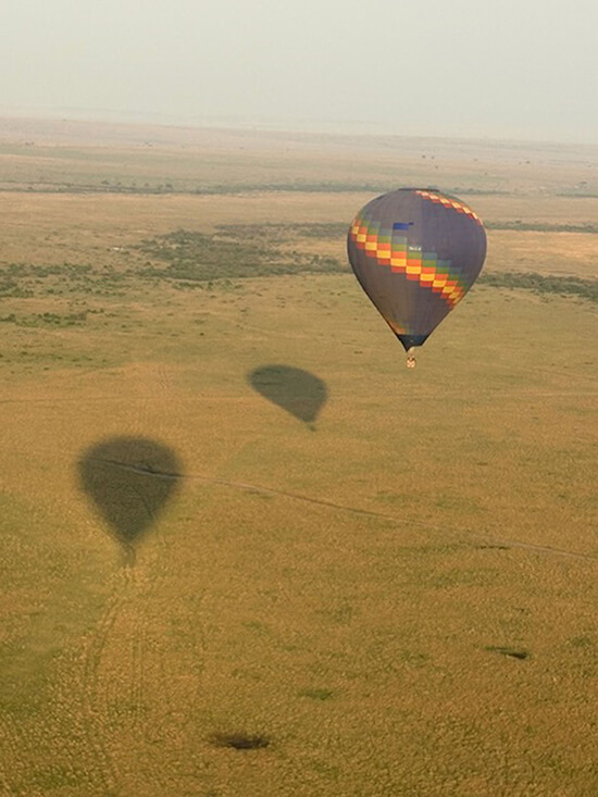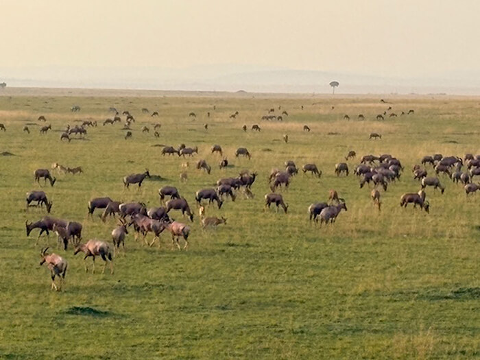 We signed up for an optional hot-air balloon ride over the Mara plains, so we woke up at 4 a.m. and took off at dawn, gliding peacefully over the grasslands. Though the pilot exerts some control, the winds will take you where they may. The captain told us to share our sightings, though being newbies, we couldn’t contribute much. Plus, he had binoculars. (Tip: Bring your own binoculars.) We saw a couple of jackals, Thomson’s gazelles leaping across the veldt (distinguished by a black stripe running across their tan flanks) and dozens of grazing wildebeest, giving us an inkling of what the Great Migration might look like from above.
