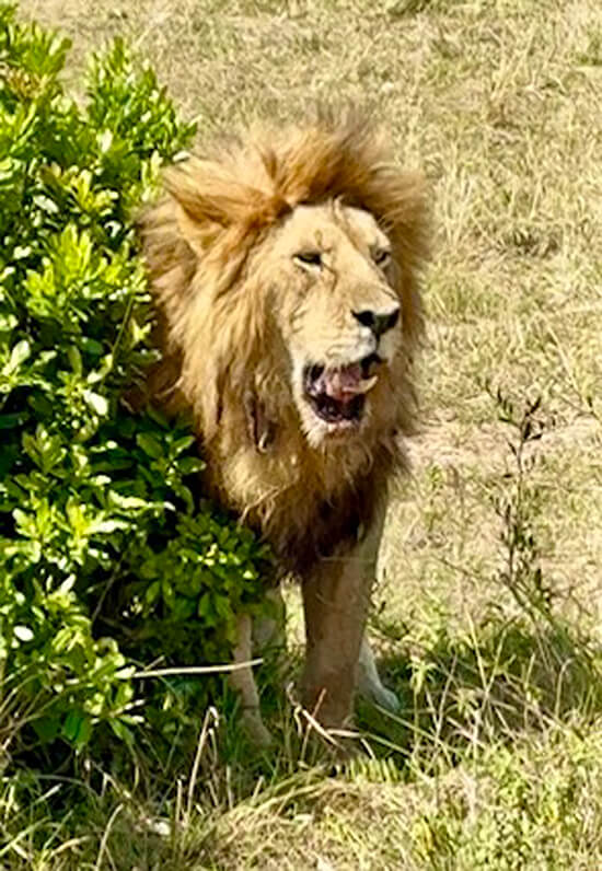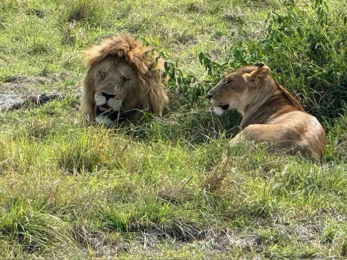Soon after, we saw more vehicles clustered around a lion couple lying in the grass. Finally, not just one lion but two, and a male and female, at that. They got up and slowly walked to a bush that offered more shade and seemed to be communicating with each other before the male mounted the female and we were treated to one of nature’s most, er, natural acts. Their mating lasted less than a minute, after which the female butted the male under the chin as if to say, “Get off,” then proceeded to roll around on her back, paws in the air, to ensure conception.