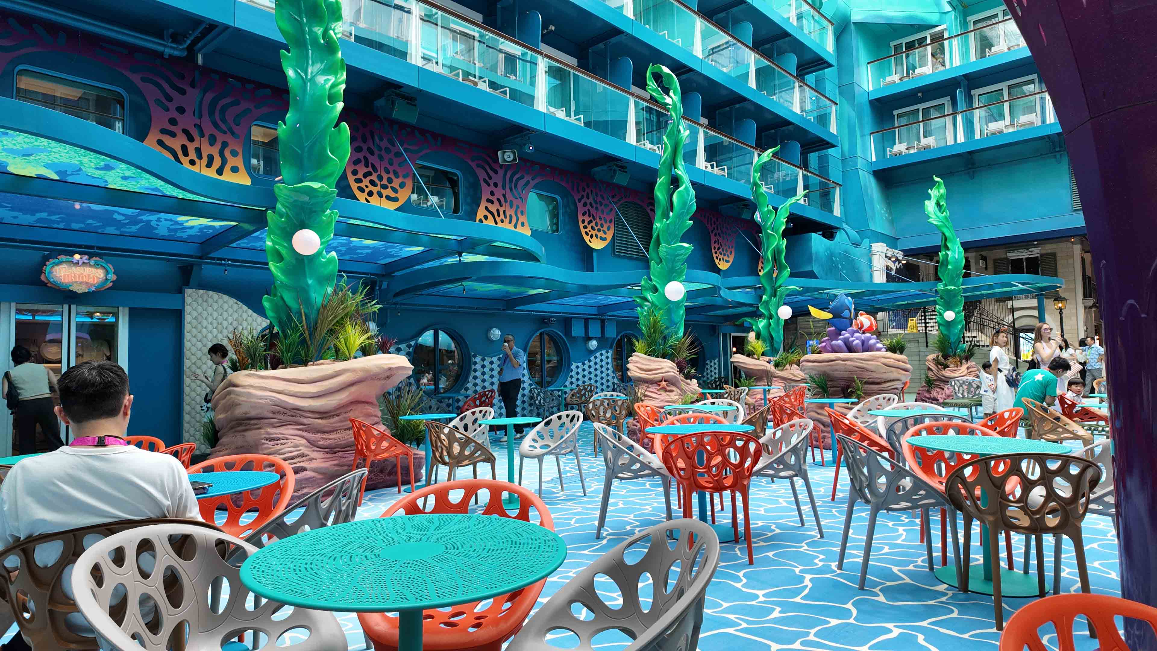 I'm already giving you a heads up, Disney songs are on repeat on the entire cruise ship, and you will find yourself humming along to them all day. But for adults, there's also live music. On any given day, you might catch live bands playing everything from alternative rock to jazz sets at the Royal Court or Tiana's Bayou Lounge. Then, over at Wayfinder Bay, the pool area transforms with late-night acoustic and DJ sets that end before midnight.