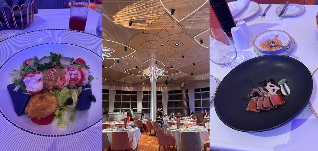For a more sophisticated vibe, there's the Hollywood Spotlight Club. This is a classy, sit-down dinner where singers and Mickey’s crew serenade you. At first, I hesitated to over-order, but my server insisted I explore the menu to its fullest. I ended up indulging in Lobster Salad, Porcini-Spiced Ahi Tuna, Burrata Mozzarella Cheese and Prosciutto di Parma, and Thai Shrimp Pumpkin Soup all in one go.